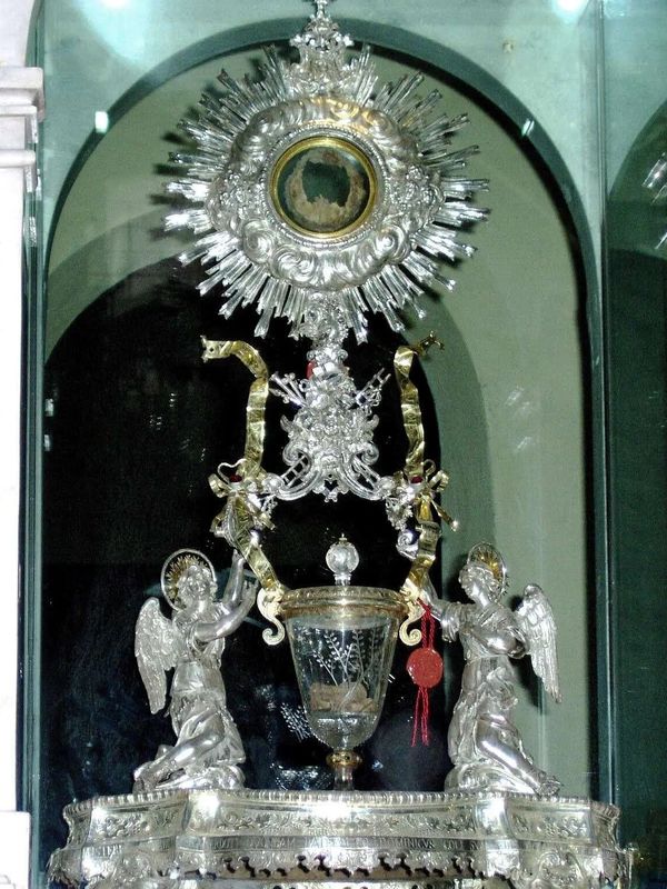 One day, as he was celebrating Mass, he witnessed the bread and wine change into actual human flesh and blood. Those attending the Mass were amazed and news quickly spread throughout the monastery and surrounding area. Shortly after this happened, the blood coagulated into five globules, which many attributed to the wounds of Jesus. The flesh remained the same. After investigation this was proclaimed a miracle and the host was placed in a special vessel, which is still on display in Lanciano today (Pictured left).